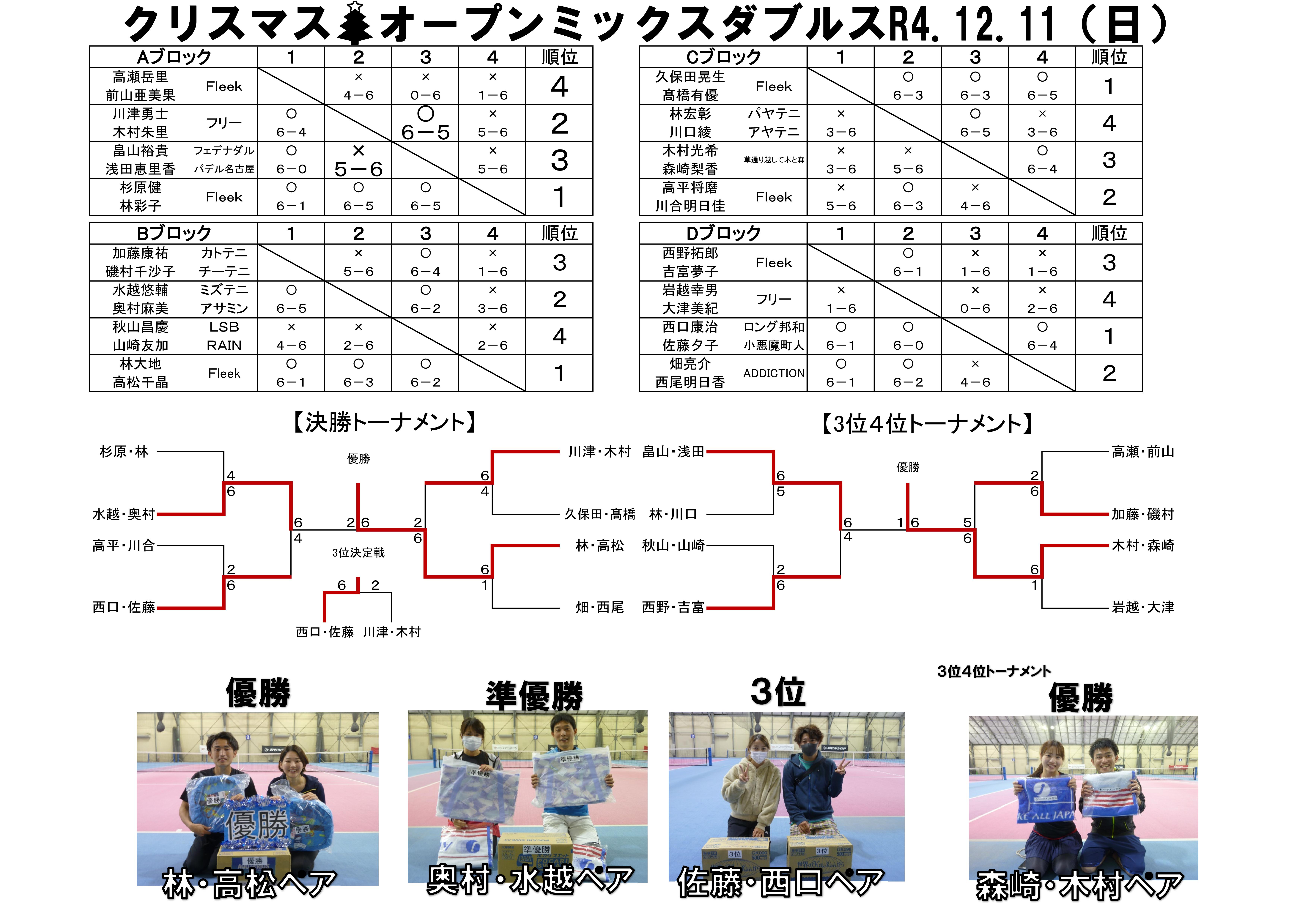 オープンクリスマスミックスダブルス結果 2022.12.11(日)