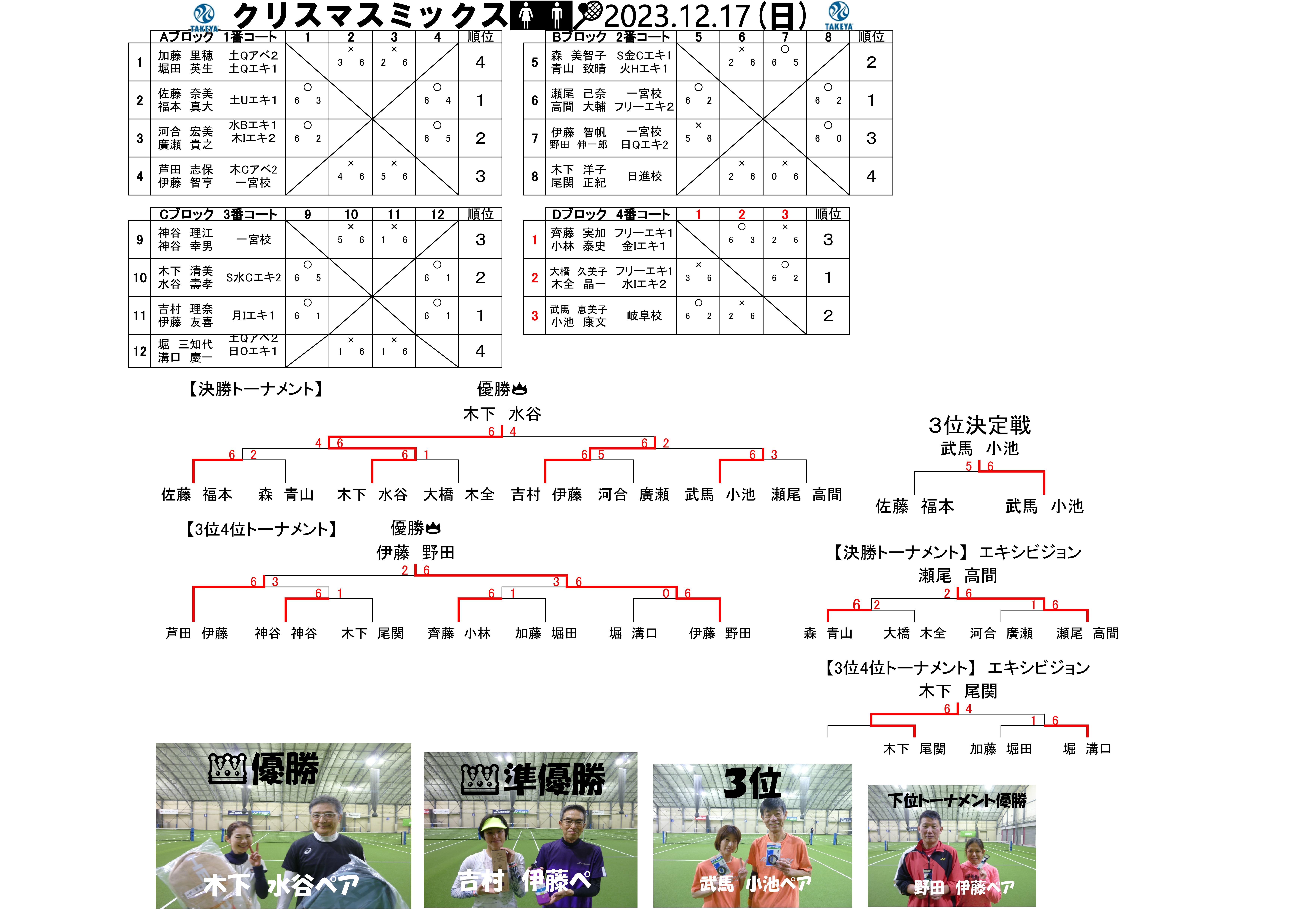 新着情報 レンタルコート当選者発表(1/5~2/15) 2023年12月22日 12/17(日) クリスマスミックスダブルス結果 2023年12月17日 2024新年謝恩大抽選会 2023年12月15日 クリスマスパーティー(12/10) 2023年12月12日 12/3TAKEYAセミオープン女子ダブルス結果 2023年12月03日 12/3TAKEYAセミオープン男子ダブルス結果 2023年12月03日